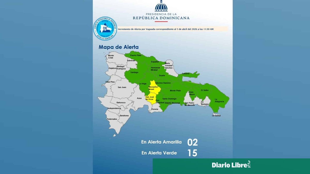 En alerta verde figuran el Distrito Nacional y las provincia Santo Domingo, San Cristóbal, La Vega, Santiago, La Altagracia, Sánchez Ramírez, Espaillat, Monte Plata, Hermanas Mirabal, Duarte, Hato Mayor, Puerto Plata, Samaná y El Seibo.